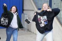 Swifties were all smiles as they left the merch shop, their arms full of sweaters and posters bearing pictures of the star and her Eras Tour logo.