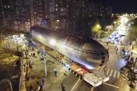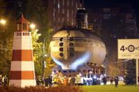 The bow of the Soviet submarine K-3 'Leninsky Komsomol' is transported by a platform along the street from the pier to the museum where it will be assembled with the stern and installed as a museum, in the city of Kronstadt, outside St. Petersburg, Russia, Wednesday, Oct. 12, 2022. K-3 'Leninsky Komsomol' (NATO reporting project name "November"), the first nuclear submarine of the Soviet Union was built in 1957 and based in Soviet Navy's Northern Fleet in Murmansk region. In 1967, while transiting the Norwegian Sea, 39 crew members of K-3 died in bow compartments in the fire. (AP Photo/Dmitri Lovetsky)