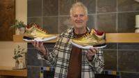 This photo provided by the Portland Rescue Mission shows Nike design legend Tinker Hatfield as he authenticates a pair of of gold Nike Air Jordan 3 sneakers that were dropped at a donation chute at the Portland Rescue Mission on Oct. 31, 2023 in Portland, Ore. A pair of rare Nike sneakers donated to a homeless shelter in Portland, Oregon, are up for auction and are expected to raise as much as $20,000. Why? They were custom-made for filmmaker Spike Lee. (Aaron Ankrom/Portland Rescue Mission via AP)