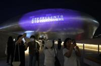 The landmark Dongdaemun Design Plaza is illuminated in purple as fans take a selfie in Seoul, South Korea, Monday, June 12, 2023. Skyscrapers, bridges and other landmarks in South Korea's capital will be lit up in purple on Monday as the country begins celebrating the 10th anniversary of K-pop band BTS, whose global popularity is a source of national pride. (AP Photo/Ahn Young-joon)
