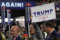 A delegate holds a sign with 'Vance" penciled in as Republican vice presidential candidate Sen. JD Vance, R-Ohio, arrives on the floor during the first day of the 2024 Republican National Convention at the Fiserv Forum, Monday, July 15, 2024, in Milwaukee. (AP Photo/Carolyn Kaster)