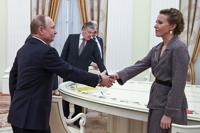 FILE - Russian President Vladimir Putin, left, greets Ksenia Sobchak, right, during his meeting with opposition candidates who ran against him in presidential election, at the Kremlin in Moscow, Russia, Monday, March 19, 2018. Russian investigators on Wednesday raided the home of Ksenia Sobchak, the glamourous daughter of Russian President Vladimir Putin's one-time boss, in a move that has sent shockwaves through the country's political scene. (Yuri Kadobnov/Pool Photo via AP, File)