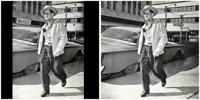 The original image for "Young Guns" was taken in the 1940s as a vertical photograph and showed bass player Dylan Brulotte's grandfather strolling through the streets of Edmonton. Gregory needed a square shape for the album cover, so he put the shot into Photoshop's generative AI tool, which artificially extended the frame's left and right edges with more detail.