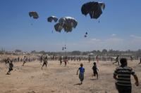 FILE - Palestinians rush to collect humanitarian aid airdropped by parachutes into Zawaida in the central Gaza Strip, Monday, Aug. 4, 2025. (AP Photo/Abdel Kareem Hana, File)