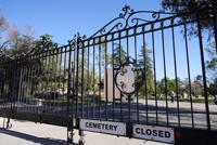 The entrance gate to the closed Mountain View Cemetery is pictured, Tuesday, Jan. 14, 2025, in Altadena, Calif. (AP Photo/Chris Pizzello)