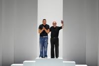 FILE - Designers Stefano Gabbana, left, Domenico Dolce accept applause after the Dolce & Gabbana Spring/Summer 2026 collection presented in Milan, Italy, Saturday, Sept. 27, 2025. (AP Photo/Luca Bruno, File)