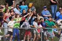 Fans reach for a baseball tossed into the crowd by Los Angeles Angels center fielder Mike Trout during the fourth inning of a spring training baseball game against the San Diego Padres Tuesday, March 10, 2026, in Tempe, Ariz. (AP Photo/Ross D. Franklin)