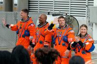Astronauts , from left, Mission Specialist Jeremy Hansen, of Canada, Pilot Victor Glover, Commander Reid Wiseman and Mission Specialist Christina Koch leave the Operations and Checkout Building for a trip to Launch Pad 39-B and a planned liftoff on NASA's Artemis II moon rocket at the Kennedy Space Center Wednesday, April 1, 2026, in Cape Canaveral, Fla. (AP Photo/Chris O'Meara)