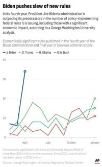 In all, federal agencies broke records by publishing 66 significant final rules in April, higher than any month in Biden's presidency, according to George Washington University's Regulatory Studies Center. More than half the rules — 34 — were the center said.