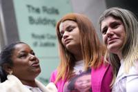 Gelvana Rodrigues, right, who lost her son Thiago, in the Fundao dam disaster, stands with other protesters outside the Royal Courts of Justice in London, Monday, Oct. 21, 2024, as lawyers representing around 620,000 Brazilians as well as businesses, municipal governments, members of the Krenak indigenous tribe are bringing a multibillion-pound legal action against BHP Group following the collapse of the Fundao dam in November 2015. (AP Photo/Alberto Pezzali)