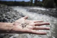 Pieces of rubber from Astroturf used in a retrofit of Electron Hydropower Project are found on the banks of the Puyallup River 14 miles down from the dam, Thursday, Aug. 27, 2020. (Steve Ringman/The Seattle Times via AP)