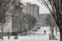 A bicyclist rides in the snow along Veterans Blvd. as a winter storm passes though the area Saturday, Jan. 24, 2026, in Owensboro, Ky. (Greg Eans/The Messenger-Inquirer via AP)