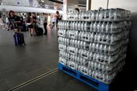 FILE - Bottles of water are piled up to give to passengers at King's Cross railway station where trains are cancelled due to the heat in London, July 19, 2022. (AP Photo/Kirsty Wigglesworth, File)