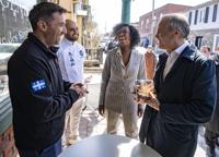 Prime Minister Mark Carney, right, and Liberal candidate Tatiana Auguste are presented with an award-winning brioche from local bakers in her riding in Terrebonne, Que., on Thursday, April 9, 2026. THE CANADIAN PRESS/Christinne Muschi