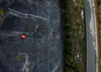 The shell of a Volkswagen Beetle hangs suspended on a cliff above the Sea-to-Sky Highway, in Squamish, B.C., on Monday, April 6, 2026. The vehicle appeared on the rock face last week with a large "E" on its roof, indicating that University of British Columbia engineering students were carrying on a long-standing tradition of placing the shell in difficult to reach locations. British Columbia's Environment Ministry is urging people to stay away from the area as they work on a plan to remove it. THE CANADIAN PRESS/Darryl Dyck