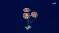 In this image from video provided by NASA, the Artemis II Orion capsule splashes down in the Pacific Ocean, on Friday, April 10, 2026. (NASA via AP)