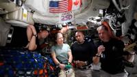 This image from video provided by NASA shows the Artemis II crew, from left, Canadian astronaut and mission specialist Jeremy Hansen, Commander Reid Wiseman, mission specialist Christina Koch and pilot Victor Glover as they speak with NASA Mission Control in a video conference while en route to the moon, Thursday, April 2, 2026. (NASA via AP)