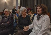 Martine Roy, left, is given support by Danie Frenette, centre, and Annick Charette after giving a statement during a press conference regarding the judgement in the class action lawsuit against Just for Laughs founder Gilbert Rozon in Montreal on Tuesday, March 31, 2026. THE CANADIAN PRESS/Christinne Muschi