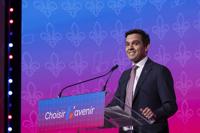 Artificial Intelligence Minister Evan Solomon, second left, speaks during a panel discussion on AI alongside MP Taleeb Noormohamed, left, president and CEO of Mila Valerie Pisano and computer scientist Yoshua Bengio, right, at the Liberal Party of Canada convention in Montreal on Friday, April 10, 2026. THE CANADIAN PRESS/Graham Hughes