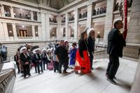 The white casket was brought up the building's grand staircase and into the legislature's ceremonial room, which was adorned with flags.