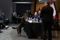 Durham Regional Police Service Major Crime - Internet Child Exploitation Det. Const. Samantha Mayhew, right, looks on as Pixel, an Electronic Storage Device locating dog, finds a thumb drive during a demonstration at a news conference in Ottawa, Wednesday, March 5, 2025. THE CANADIAN PRESS/Adrian Wyld