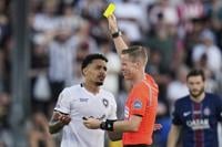 Referee Drew Fischer shows a yellow card to Botafogo's Gregore during the Club World Cup group B soccer match between PSG and Botafogo in Pasadena, Calif., Thursday, June 19, 2025. (AP Photo/Gregory Bull)