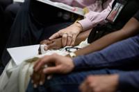 FILE - Family members of the victims of American Airlines flight 5342 who perished in a collision with a U.S. military helicopter, comfort each other while listening to the audio of the flight radio transmissions during the NTSB fact-finding hearing on the DCA midair collision accident at the National Transportation and Safety Board boardroom, July 30, 2025, in Washington. (AP Photo/Rod Lamkey, Jr., File)