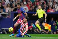 Barcelona's Lamine Yamal, top is tackled and fouled by Atletico Madrid's Nico Gonzalez, who receives a second yellow card and is then sent off during a La Liga soccer match between Atletico Madrid and Barcelona in Madrid, Spain, Saturday, April 4, 2026. (AP Photo/Bernat Armangue)