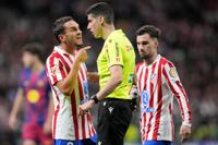 Referee Mateo Busquets speaks to Atletico Madrid's Koke during a La Liga soccer match between Atletico Madrid and Barcelona in Madrid, Spain, Saturday, April 4, 2026. (AP Photo/Bernat Armangue)
