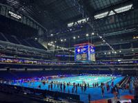 The game is shown on a 35-foot screen, while DJs pump up the crowd and lights are beamed on the historic church's walls.