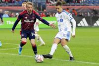 CF Montreal midfielder Ivan Jaime (10) passes the ball as New England Revolution midfielder Jackson Yueill (14) closes in during the second half of an MLS soccer match Saturday, April 4, 2026, in Foxborough, Mass. (AP Photo/Mark Stockwell)