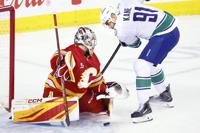 Vancouver Canucks' Evander Kane (91) has a shot stopped by Calgary Flames goalie Dustin Wolf during second period NHL hockey action in Calgary, Saturday, March 28, 2026. THE CANADIAN PRESS/Larry MacDougal