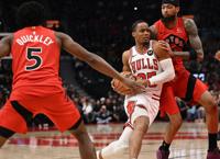 Chicago Bulls' Isaac Okoro (35) drives between Toronto Raptors' Immanuel Quickley (5) and Brandon Ingram (3) during first half NBA basketball game action in Toronto on Thursday, Feb. 5, 2026. THE CANADIAN PRESS/Jon Blacker