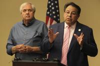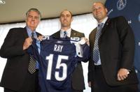 Toronto Argonauts new quarterback Ricky Ray (centre) poses with GM Jim Barker (left) and head coach Scott Milanovich at a news conference to introduce him in Toronto on Tuesday December 14, 2011. The veteran quarterback says he was shocked when told by the Edmonton Eskimos he had been dealt to Toronto. THE CANADIAN PRESS/Frank Gunn