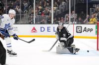 Toronto Maple Leafs centre Steven Lorentz, left, scores on Los Angeles Kings goaltender Darcy Kuemper during the first period of an NHL hockey game Saturday, April 4, 2026, in Los Angeles. (AP Photo/Mark J. Terrill)