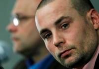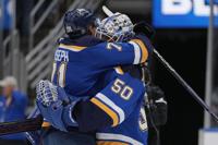St. Louis Blues goaltender Jordan Binnington (50) and teammate Mathieu Joseph (71) celebrate a 2-1 victory over the Calgary Flames following an NHL hockey game Tuesday, Jan. 14, 2025, in St. Louis. (AP Photo/Jeff Roberson)