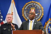 FBI Assistant Director in Charge Akil Davis, right, speaks in front of LAPD Chief Jim McDonnell while announcing developments on a terrorism investigation during a press conference Monday, Dec. 15, 2025, in Los Angeles. (AP Photo/Damian Dovarganes)