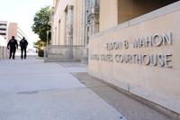 Officers with the Department of Homeland Security walk on the sidewalk outside the Eldon B. Mahon U.S. Courthouse during a trial for nine people connected to a 2025 shooting outside an ICE detention facility, in Fort Worth, Texas, Thursday, March 12, 2026. (AP Photo/Tony Gutierrez)