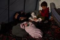 Alongside her brother Khalid, 15-day-old Shaiman sleeps in the tent where she was born, which the family is using as a shelter in Beirut, Sunday, April 12, 2026. (AP Photo/Emilio Morenatti)