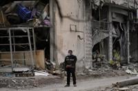 A member of Hezbollah stands guard next to a destroyed building in Dahiyeh, Beirut's southern suburbs, Lebanon, Friday, April 17, 2026, following a ceasefire between Israel and Hezbollah. (AP Photo/Bilal Hussein)
