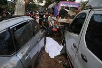 People gather around vehicles damaged in an attack on the Pan-American Highway in Cajibio, Colombia, Saturday, April 25, 2026, that killed at least a dozen people and authorities blamed on dissident groups of the former FARC rebels. (AP Photo/Santiago Saldarriaga)