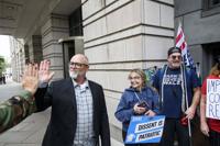 Jan Carey, left, a North Carolina veteran who burned a flag near the White House last month, talks with his supporters following his arraignment at the E. Barrett Prettyman Federal Courthouse, Wednesday, Sept. 17, 2025, in Washington. (AP Photo/Rod Lamkey, Jr.)