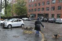 A person walks past a large tree after falling over several cars after strong winds in Gothenburg, Sweden, Saturday Oct. 5, 2025. (Björn Larsson Rosvall/TT via AP)