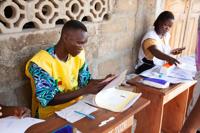 Electoral officials prepare presidential ballot papers at a polling station in Cotonou, Benin, Sunday, April 12, 2026. (AP Photo/Abadjaye Justin Sodogandji)