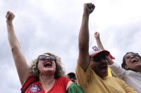 Social movement activists make the "L" for Lula during a pro-democracy event on the second anniversary of the alleged coup attempt when supporters of former President Jair Bolsonaro invaded government buildings and called for military intervention in Brasilia, Brazil, Wednesday, Jan. 8, 2025. (AP Photo/Luis Nova)