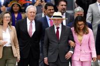 Brazilian President Luiz Inacio Lula da Silva, with a hat, and his wife Rosangela da Silva, descend the ramp of the presidential palace during a ceremony marking two years since the alleged coup attempt when supporters of former President Jair Bolsonaro invaded government buildings and called for military intervention in Brasilia, Brazil, Wednesday, Jan. 8, 2025. (AP Photo/Eraldo Peres)