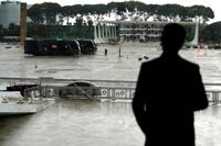 A worker at Planalto Palace, the office of the president, looks out at the Suprema Court where security vehicles are parked in Brasilia, Brazil, Wednesday, Jan. 11, 2023, ahead of expected protests called for by supporters of former Brazilian President Jair Bolsonaro. (AP Photo/Eraldo Peres)