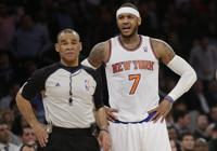 FILE - New York Knicks' Carmelo Anthony (7) argues a call with referee Dan Crawford (43) during the second half of an NBA basketball game, Wednesday, Feb. 5, 2014, in New York. (AP Photo/Frank Franklin II, File)