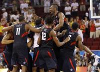 FILE - Team USA, with Kobe Bryant at top right, celebrates following their win over Spain in their men's gold medal basketball game at the Beijing 2008 Olympics in Beijing, Sunday, Aug. 24, 2008. (AP Photo/Eric Gay, File)