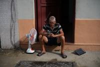 A man charges his phone and his fan with a solar panel during a blackout in Havana, Tuesday, March 17, 2026. (AP Photo/Ramon Espinosa)